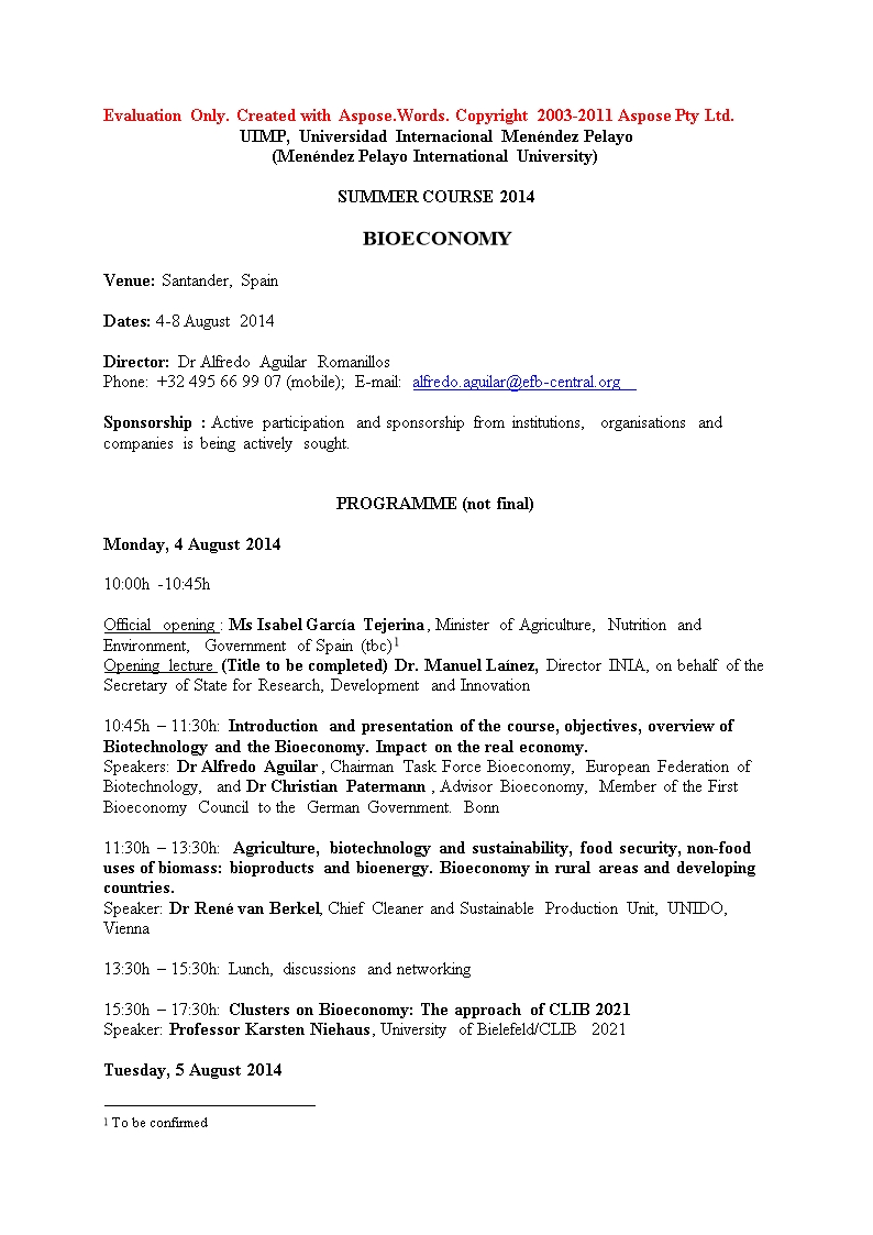 El seminario tiene como objetivo la Bioeconomía para discutir los desafíos y el potencial de la bioeconomía en el entorno español, europeo y mundial con la opinión de expertos internacionales del mundo académico, las instituciones gubernamentales y de la industria. Dada la naturaleza del Seminario, las presentaciones y los debates, tanto de los ponentes como por los estudiantes estarán en Inglés. Más información en el documento adjunto